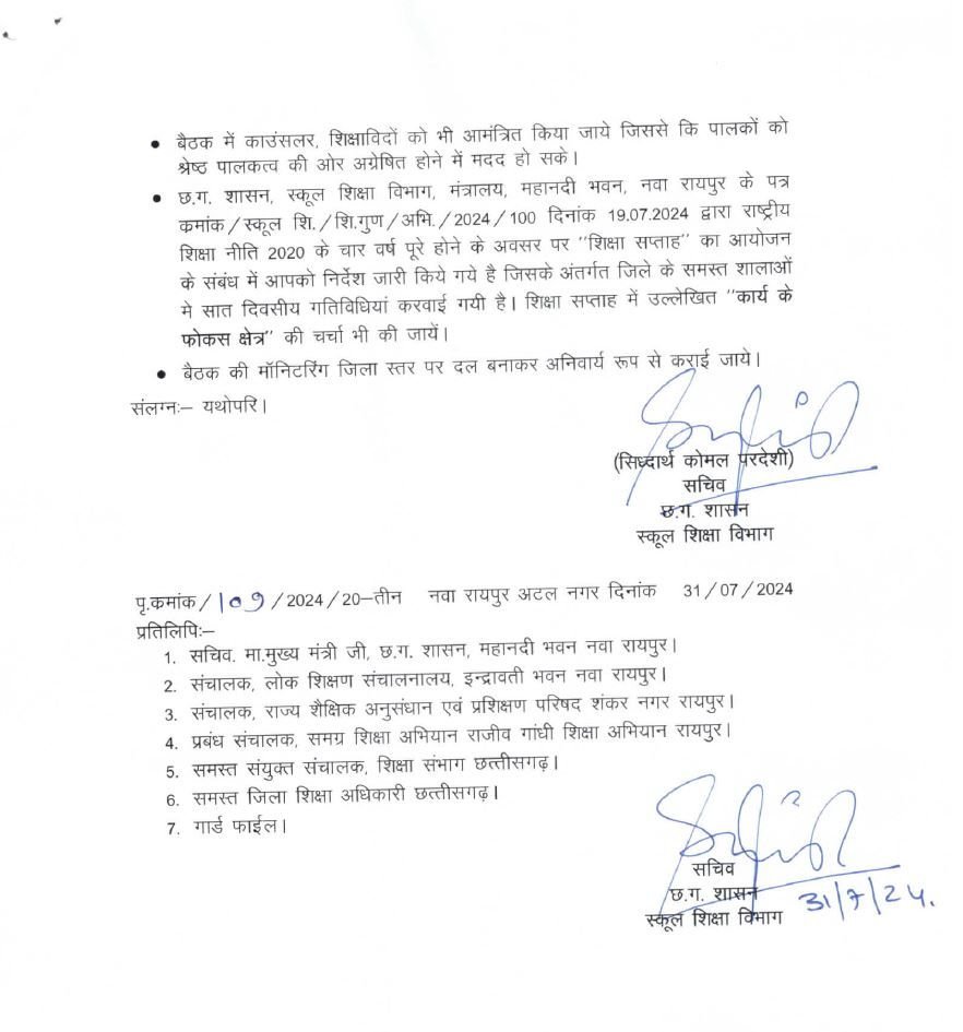 दुर्ग, छत्तीसगढ़// प्रदेश के शिक्षा विभाग ने सभी जिले के कलेक्टरों को निर्देश जारी किया कि अब सभी सरकारी स्कूलों में भी नियमित रूप से पेरेंट्स टीचर मीटिंग रखा जाएगा, जिसके लिए तैयारी करने के निर्देश दिए हैं। आगामी 6 अगस्त को क्लस्टर स्तर पर पैरेंट्स टीचर मीटिंग होगी। शिक्षा विभाग द्वारा 12 पॉइंट्स पर पैरेंट्स से फीडबैक लेने के निर्देश दिए गए हैं। इस बैठक में टीचर्स सरकार द्वारा संचालित विद्यार्थी हितग्राही योजनाओं की संपूर्ण जानकारी पेरेंट्स को देंगे जिससे पेरेंट्स एवं स्टूडेंट को योजनाओं का पूरा लाभ मिल सके।