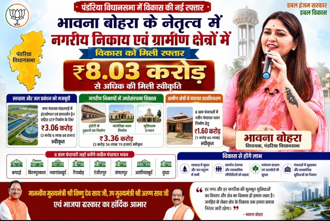 विधायक भावना बोहरा की सक्रिय पहल के चलते नगर पालिका परिषद पंडरिया, नगर पंचायत इंदौरी एवं पांडातराई सहित ग्रामीण क्षेत्रों में बहुप्रतीक्षित विकास कार्यों को मंजूरी मिली है। यह स्वीकृति राज्य शहरी अभिकरण, अधोसंरचना मद, राज्य प्रवर्तित योजना एवं खनिज साधन विभाग के माध्यम से प्रदान की गई है।