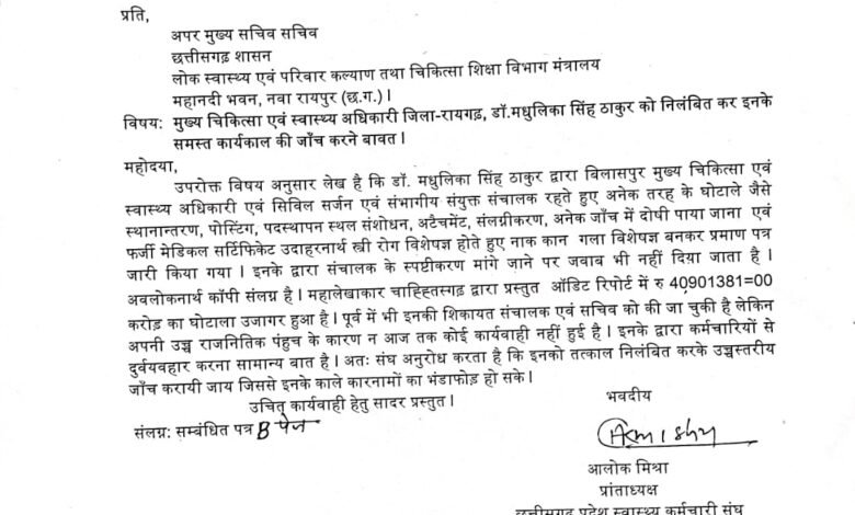 भास्कर न्यूज24/बिलासपुर/मुंगेली – प्रदेश स्वास्थ्य कर्मचारी संघ ने सीएमएचओ के खिलाफ अपर मुख्य सचिव स्वास्थ्य एवम परिवार कल्याण विभाग को…